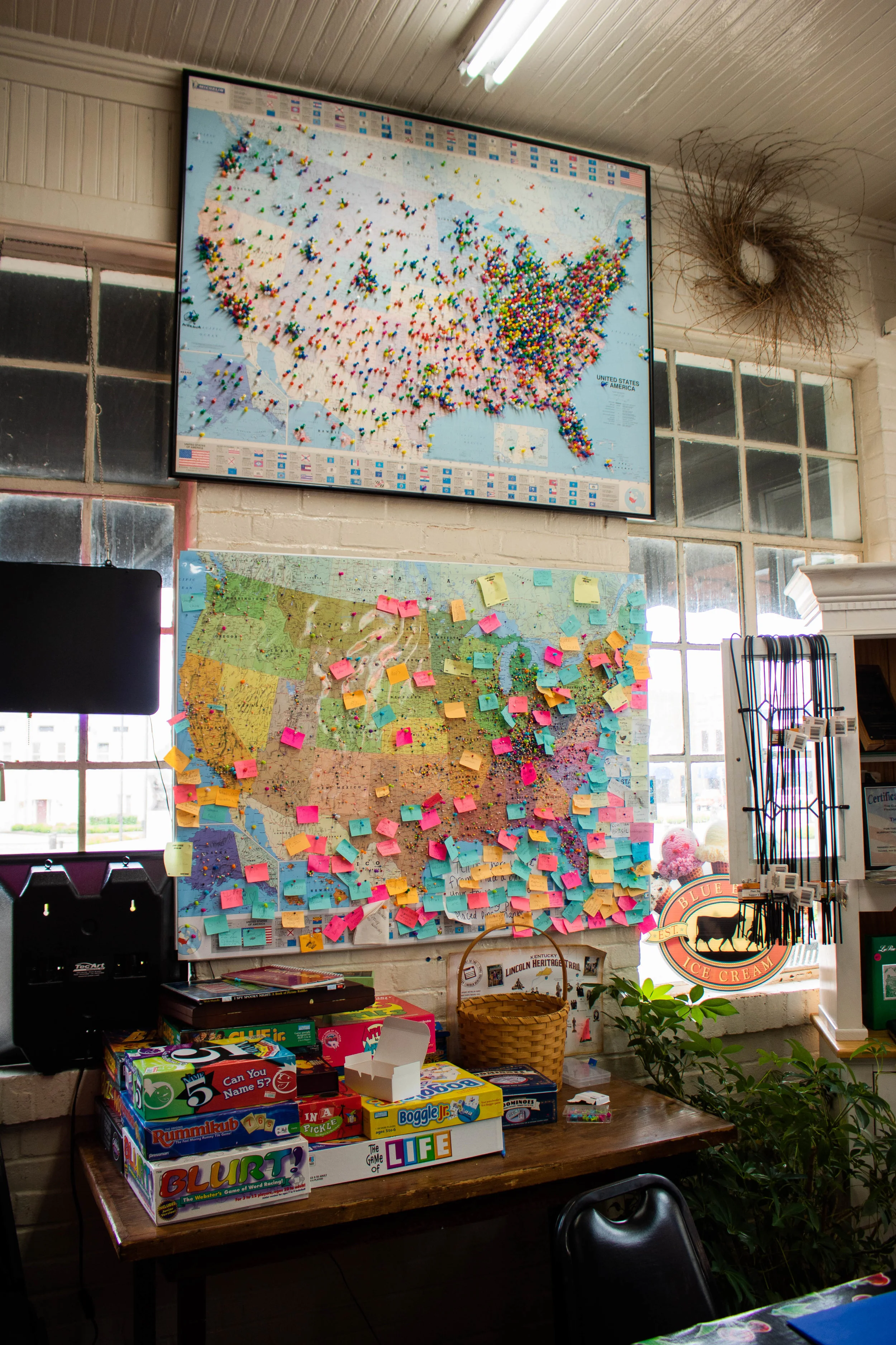 When you walk into the store, you’ll see two maps on the wall to the right – the first map filled up quickly and they’ve expanded to a second – with thousands of pins and sticky notes marking the origin of visitors all the way back to 2007.
