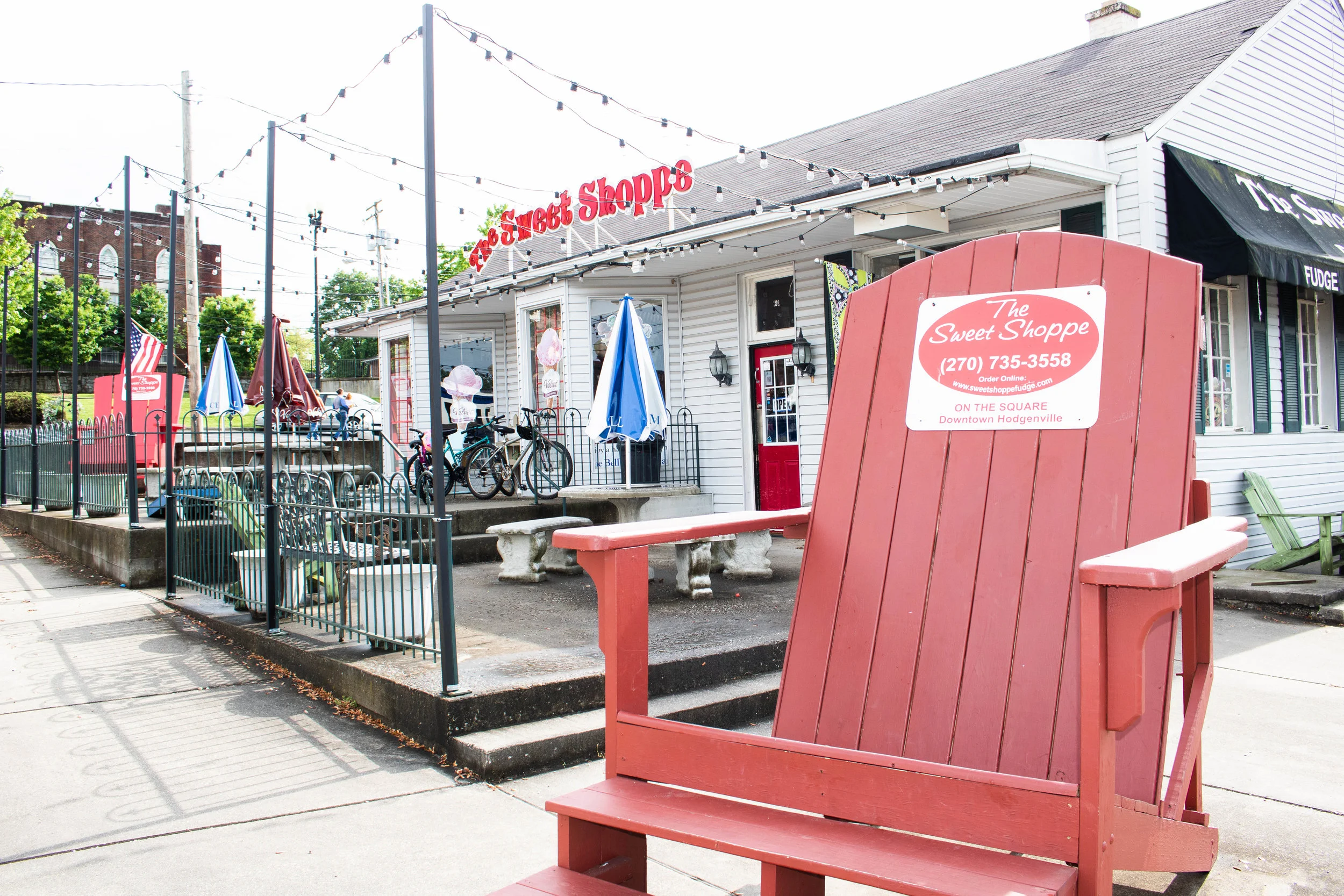 Pat credits The Sweet Shoppe’s location to their success. A charming storefront on Hodgenville’s square, The Sweet Shoppe offers a laid back, hometown feel – the perfect atmosphere for tourists and families alike on their patio adorned with string lights and picnic tables and a giant chair for a photo op.